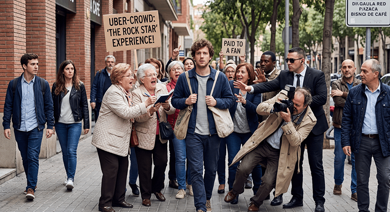 ¿Te sientes solo caminando por la calle? Con esta app, contratas a una multitud de figurantes que te siguen a todas partes. La vuelta de tuerca: El paquete "Estrella de Rock" incluye a tres señoras que te piden autógrafos de forma histérica y un falso paparazzi que se tropieza al intentar sacarte una foto.