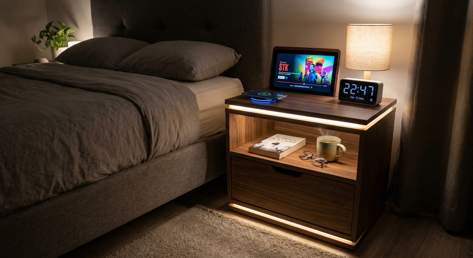 La mesita de noche con luz incorparada, cargador de móvil un reloj e incluso una pantalla para ver series o películas